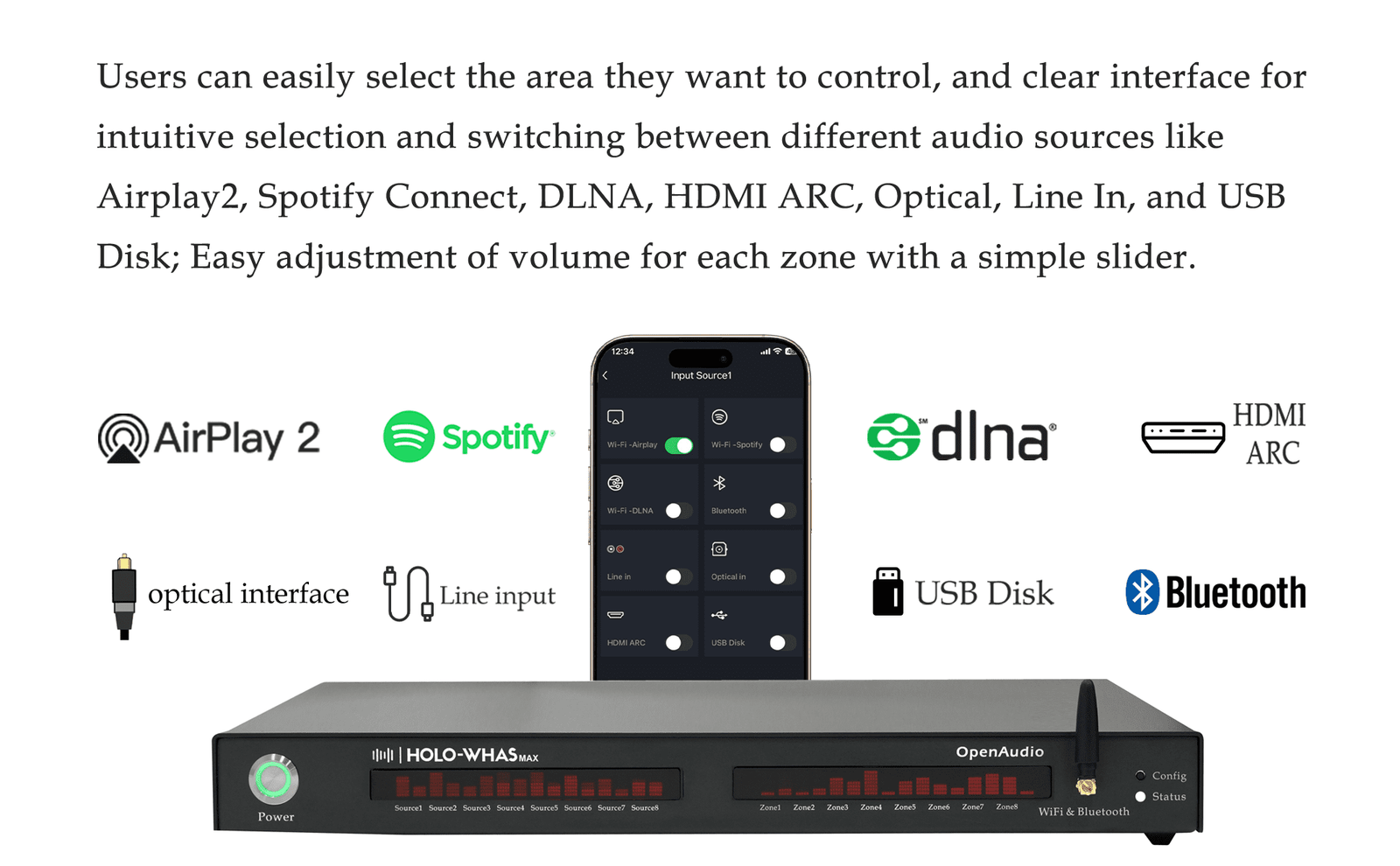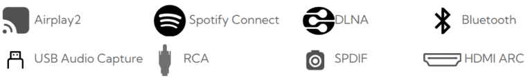 Simple Audio Source Switching: Clear interface for intuitive selection and switching between different audio sources like Airplay2, Spotify, DLNA, Spotify Connect, Bluetooth, HDMI ARC, Line In and Spdif,etc.