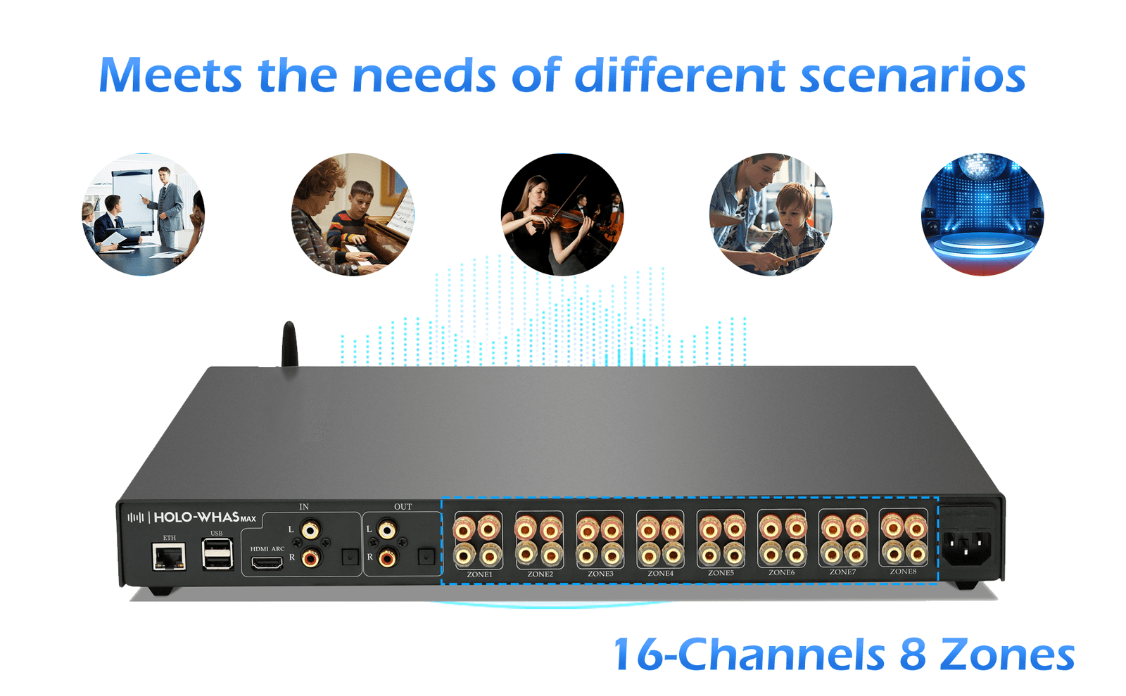 HOLOWHAS Max is an 8 Streaming 8-zone multi-room streaming amplifier, its power output capability is 16 x 200W@8ohm, so the total is 3200W@8ohm, surpass all other similar products. It is an ideal solution for distributing HiFi audio to different rooms or zones within the whole house or building with pre-wired speakers. This allows you to play different audio sources in different areas or synchronize the playback for a consistent listening experience throughout.